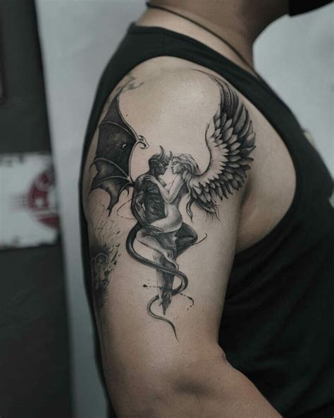 Angel devil tattoos are popular. See more ideas about angel, demon tattoo, angel demon tattoo. We're angels and demons tattoo and we've been a local tattoo shop here in bargersville, in, since 2009. Devil and angel tattoos combined together present the balance between good and evil in a person, the portray of devil is used for bad deeds and angel for good deeds.