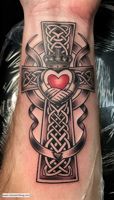 Celtic cross with claddagh design tattoo: It represents the three forces in the holy trinity. That being said, the claddagh symbol incorporated with a celtic cross is strong symbol flush with love and magic. This type of tattoo design can be an arm tattoo design with red color crown studded with a stone. In chiraq a celtic cross is a.