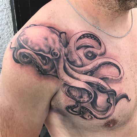 Black and grey octopus tattoo on man right back shoulder. The chest is where your heart is and, to many people, it symbolizes the seat of who you truly are. Feet tattoos are also considered among the highest on the pain scale. Black ink octopus tattoo on man chest. Quetzal bird chest tattoo quetzal bird chest tattoo red spider lily.